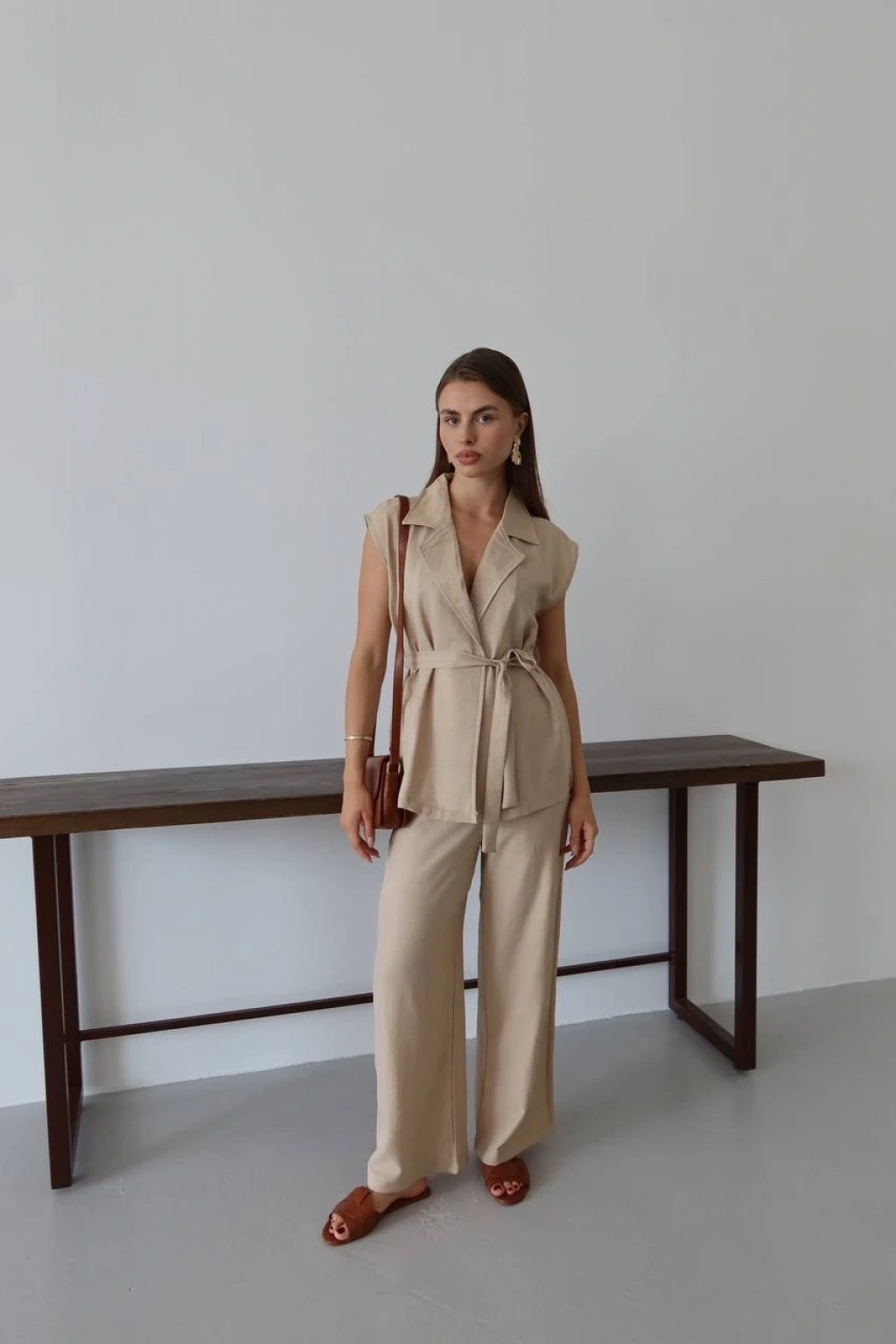 keten yelek pantolon takım bej rengi ile şıklığı ve rahatlığı bir arada sunuyor.
